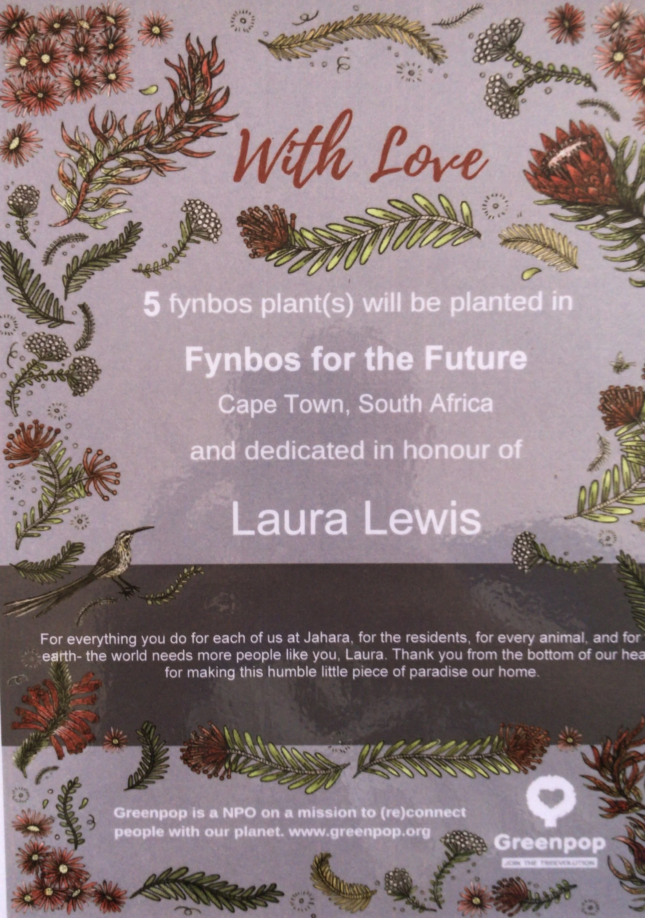 We were completely taken aback when somehow our staff had managed to trick me into sitting to watch a movie (a weird experience for a Friday afternoon and looking back I can see how I had been totally set up). What they presented though blew my mind and showed me just how incredible and thoughtful our staff are. They had paid to support Fynbos for the Future on Laura’s behalf which if you know Laura is such a kind gesture to her.
